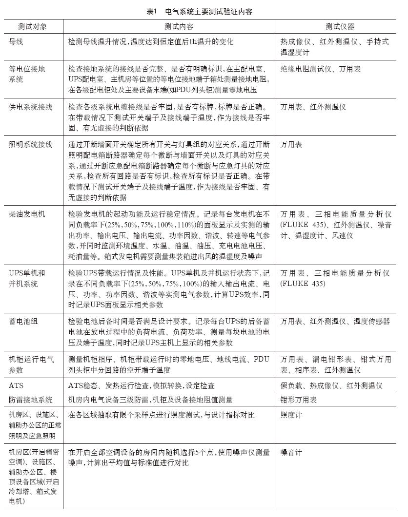 數(shù)據(jù)中心基礎(chǔ)設(shè)施的電氣系統(tǒng)不但承擔(dān)著保障IT設(shè)備電力供應(yīng)和電能質(zhì)量的任務(wù),還要解決空調(diào)設(shè)備、機(jī)房照明、應(yīng)急照明、消防、監(jiān)控等其他設(shè)備的用電問題,是基礎(chǔ)設(shè)施中最為重要的子系統(tǒng),也是為數(shù)據(jù)中心提供運行動力的基礎(chǔ),所以對電氣系統(tǒng)的測試驗證工作尤為重要。