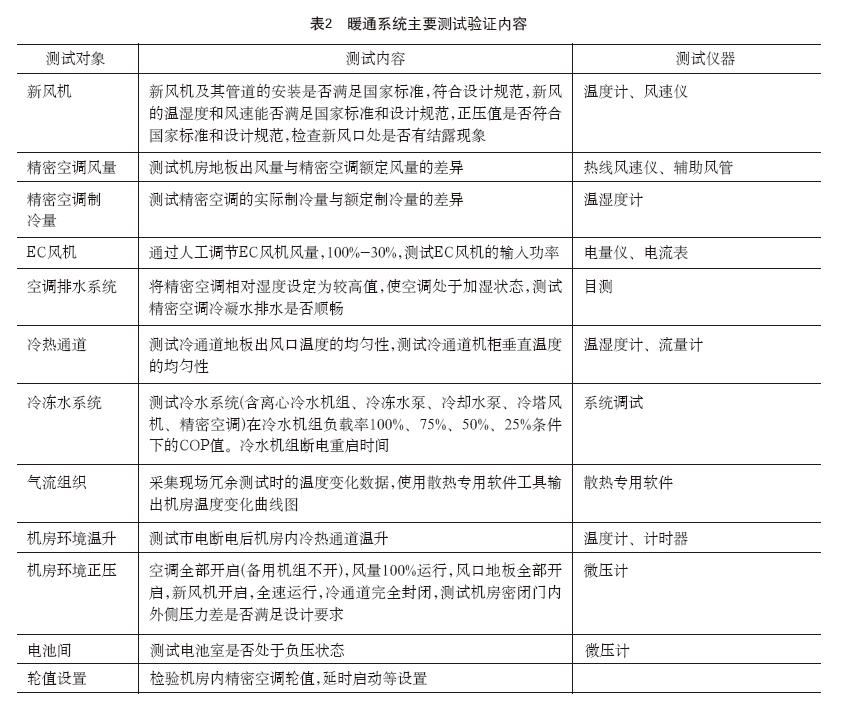 暖通系統(tǒng)的測試驗證工作主要是驗證空調(diào)及相關(guān)設(shè)備的性能和運行參數(shù)是否符合設(shè)計要求,證暖通系統(tǒng)是否能滿足設(shè)計負(fù)載對制冷量的要求,驗證系統(tǒng)作為一個整體是否能滿足運行要求并與其他系統(tǒng)匹配運行,驗證系統(tǒng)在故障情況下是否能做出預(yù)期的反應(yīng)并有一定的抗故障能力。有關(guān)暖通系統(tǒng)的測試驗證主要工作內(nèi)容見表2。