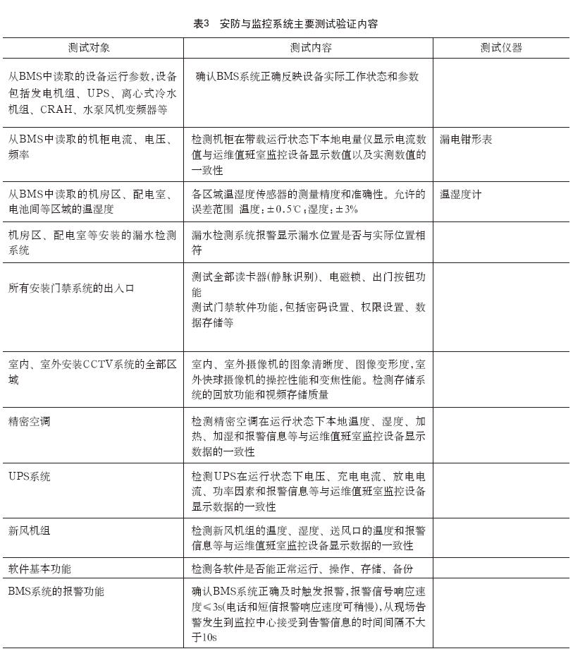 安防與監(jiān)控系統(tǒng)的測試驗證工作主要是驗證系統(tǒng)相關(guān)設(shè)備的性能和運行參數(shù)是否符合設(shè)計要求,驗證系統(tǒng)作為一個整體是否能滿足運行要求并與其他系統(tǒng)匹配運行,驗證監(jiān)控系統(tǒng)是否能正確的反映被監(jiān)控設(shè)備的工作狀態(tài)、運行參數(shù)、歷史數(shù)據(jù),驗證安防系統(tǒng)是否能起到有效保障數(shù)據(jù)中心安全的目標(biāo)。有關(guān)安防與監(jiān)控系統(tǒng)的測試驗證主要具體工作內(nèi)容見表3。