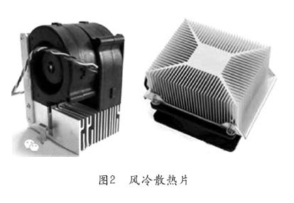 風(fēng)冷散熱片是最常見的散熱器件,一般是導(dǎo)熱性能比較好的鋁或銅等材料,加工成散熱翅片以增加散熱面積和效率,通過特殊的介質(zhì)(通常是導(dǎo)熱硅脂)緊貼住發(fā)熱量很大的芯片,然后再在散熱片上固定一個風(fēng)扇來增加流速,提升換熱能力,更快帶走熱量,從而達(dá)到對芯片散熱的目的。提升風(fēng)冷散熱的途徑是提高散熱面積、提高換熱系數(shù)、提升輻射散熱效率、使用散熱效率更佳的材料、粘合充分接觸保證降低傳導(dǎo)熱阻等,風(fēng)冷散熱片如圖2所示。