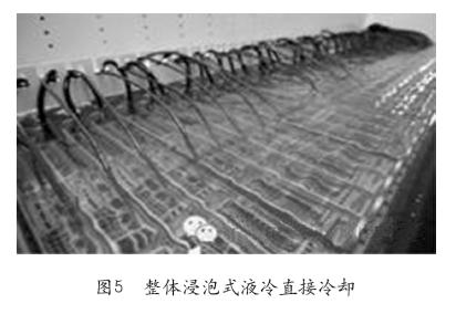 直接冷卻是采用密閉的氟化液等礦物質(zhì)直接浸泡冷卻IT設(shè)備的芯片、內(nèi)存等發(fā)熱部件,形成密封的一級散熱循環(huán)系統(tǒng),而二級循環(huán)系統(tǒng)可以采用自然風(fēng)冷或者冷卻水系統(tǒng)進(jìn)行冷卻。對比間接制冷系統(tǒng),直接冷卻對發(fā)熱元器件冷卻的均勻度更好,冷卻液溫度可以更高,尤其是選擇一定溫度下相變的液體,局部散熱能力強,散熱效果更好;比如對于60℃的芯片,可以采用50℃冷卻水或冷卻蒸發(fā)溫度在55~60℃的冷媒流體,因此,即使夏季45℃高溫天氣,也可以實現(xiàn)直接新風(fēng)冷卻或者冷卻塔,從而數(shù)據(jù)中心實現(xiàn)全年自然冷卻,降低能耗,這對于全球溫帶和熱帶區(qū)域?qū)崿F(xiàn)制冷系統(tǒng)的高效帶來了突破,是有競爭力的制冷方案。整體浸泡式液冷直接冷卻如圖5所示。