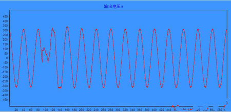 將具有IGBT短路檢查功用的兩個UPS模塊刺進(jìn)UPS機(jī)柜,短路其間一個功率模塊的逆變IGBT,運用功率模塊的毛病錄播功用,功率模塊在發(fā)作逆變IGBT短路時會主動保留逆變IGBT短路時刻前后的輸出電壓波形。該波形如下: