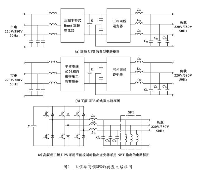 2009年,在《UPS應(yīng)用》的組織發(fā)動(dòng)下,進(jìn)行了一場工頻與高頻UPS的大辯論,結(jié)果是高頻UPS獲勝。工頻UPS失敗的原因是:SCR多相相控整流是一個(gè)時(shí)滯環(huán)節(jié),無法實(shí)現(xiàn)輸出電壓的快速調(diào)節(jié),并會(huì)導(dǎo)致市電電網(wǎng)電壓畸變,對市電*大,輸入功率因數(shù)低、效率低、體積重量大,直流電壓調(diào)節(jié)為非線性,對市電電壓波動(dòng)適應(yīng)能力差,不能數(shù)控等而被淘汰。此后,由于采用平衡電感24相自耦變壓工頻整流器和采用自耦變壓器的多相工頻整流與 U d -PWM控制的研制成功,使工頻UPS的性能完全趕上了高頻UPS,但是高頻UPS的開關(guān)損耗要大8~33倍[視高頻UPS的開關(guān)頻率(10~20)kHz,與工頻UPS整流器的相數(shù)(12~24相)而定],這又促使高頻UPS開關(guān)研制出了SPWM節(jié)能控制與軟開關(guān)技術(shù)的應(yīng)用,而SPWM節(jié)能控制又促使高頻UPS的輸出逆變器采用了中性點(diǎn)形成變壓器NFT的應(yīng)用,把高頻UPS的開關(guān)損耗減小了50%以上。至此工頻與高頻UPS的性能已經(jīng)基本相同,并達(dá)到了相當(dāng)高的水平(市電輸入功率因數(shù)PF都達(dá)到了0.999,對市電電壓波動(dòng)的適應(yīng)能力都達(dá)到了±30%,整機(jī)效率都達(dá)到了94%,體積重量兩者基本相同)。工頻與高頻UPS的典型電路框圖如圖1所示,其中圖(a)為高頻UPS的典型電路框圖,圖(b)為工頻UPS的典型電路框圖,圖(c)為高頻或工頻UPS采用節(jié)能控制時(shí)逆變器采用中性點(diǎn)形成變壓器NFT輸出的電路框圖。