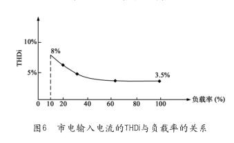 系統(tǒng)負(fù)載率的減小可以使供電系統(tǒng)的效率下降,如圖5所示,也可以是市電輸入電流的THDi增大,如圖6所示,因此對市電的污染程度也增大了。