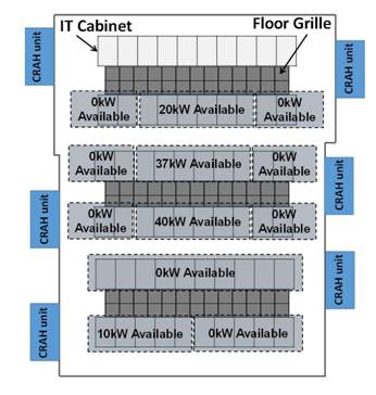 在圖8(a)中,數(shù)據(jù)中心運(yùn)營(yíng)商有一個(gè)虛擬的設(shè)施模型和IT庫(kù)存。IT經(jīng)理確定新的服務(wù)器被部署的要求,并為它們分配機(jī)柜上的可用空間和電力容量(圖8b)。而通過(guò)虛擬設(shè)備模型預(yù)測(cè)發(fā)現(xiàn),這樣的配置將出現(xiàn)散熱問(wèn)題,如圖8(c)所示,其中的圓圈區(qū)域表示服務(wù)器的空氣平均進(jìn)氣溫度大于27攝氏度,設(shè)施人員可以其確定適當(dāng)?shù)奈恢茫⑼ㄟ^(guò)這些服務(wù)器的虛擬模型與IT經(jīng)理進(jìn)行協(xié)調(diào)。這方面的努力可能涉及到幾個(gè)迭代的工作流模型,如圖7所示。其最終的結(jié)果是設(shè)施將得到不斷發(fā)展,如圖9所示的冷卻地圖,顯示了在不同的機(jī)柜位置的冷卻可用性。
