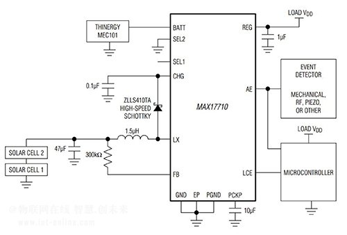 圖4:接口的低電壓能量收集源諸如太陽能電池向Maxim MAX17710電源管理。