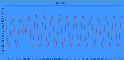 將具有IGBT短路檢測功能的兩個UPS模塊插入UPS機(jī)柜,短路其中一個功率模塊的逆變IGBT,利用功率模塊的故障錄播功能,功率模塊在發(fā)生逆變IGBT短路時自動保存逆變IGBT短路時刻前后的輸出電壓波形。該波形如下圖所示: