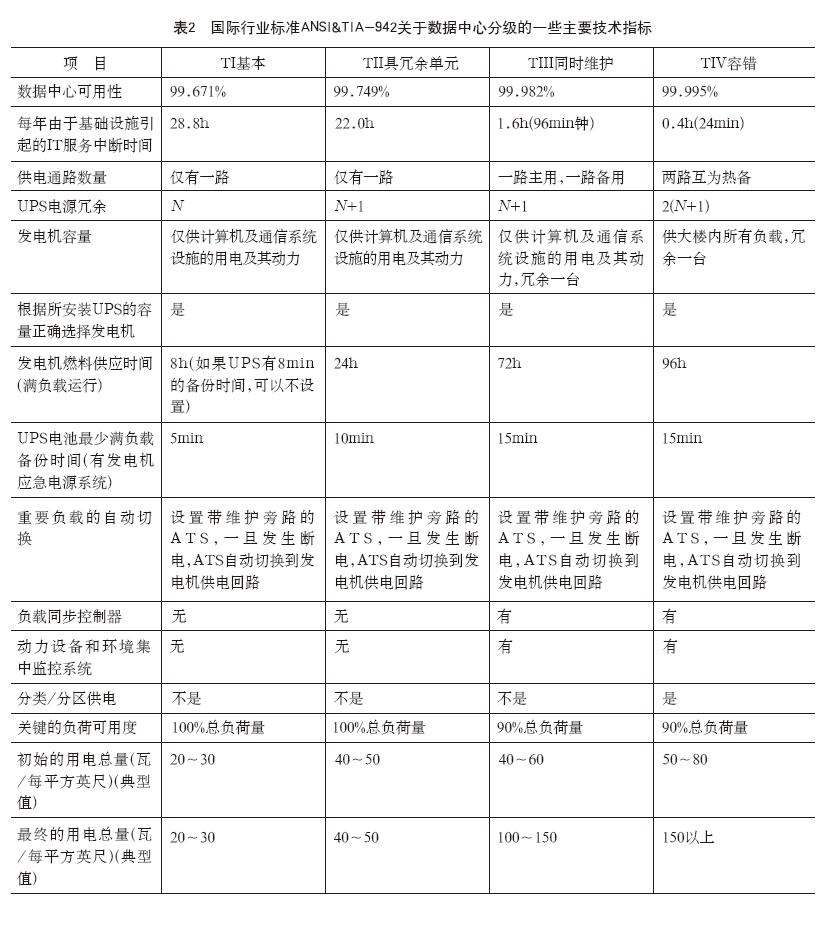 2 數(shù)據(jù)中心各等級的技術(shù)特征