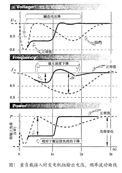 AVR安裝在發(fā)電機內(nèi),其功能是將因負(fù)載接入造成的輸出電壓跌落值負(fù)反饋地調(diào)控成轉(zhuǎn)子磁場的增強,從而促使輸出電壓返回正常值。在此功能上加入負(fù)載調(diào)節(jié)模塊,當(dāng)重負(fù)載使發(fā)動機主軸轉(zhuǎn)速低于設(shè)定值時,模塊自動調(diào)節(jié)電壓下降一定量,等同于負(fù)載量減少相應(yīng)值,促使發(fā)動機能較快地達(dá)到額定轉(zhuǎn)速。從而顯著地削弱了由于重負(fù)載接入引起的頻率和電壓波動。如圖1中的實線曲線所示。這就有效地減少了對用電設(shè)備的*。