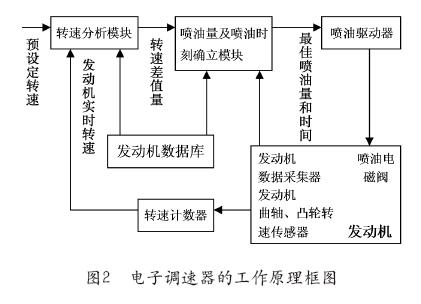 電子調(diào)速器的特點是,它將發(fā)動機的各功能部件的工作狀態(tài)智能地聯(lián)系并協(xié)同成一個整體,綜合研判它們的實時參數(shù)并求得最佳值,以此作為指令將燃油按照最適宜的時刻和油量由電磁閥(油門)噴入汽缸爆燃,驅(qū)動主軸轉(zhuǎn)動,使發(fā)動機在額定的輸出功率范圍內(nèi),無論被驅(qū)動負(fù)載怎樣變化,都能以迅速、精確的調(diào)控確保轉(zhuǎn)速穩(wěn)定在25r/s。它的工作程序是:位于主軸和凸輪軸的兩個轉(zhuǎn)速傳感器將信號送至轉(zhuǎn)速計數(shù)器,得出實時的發(fā)動機轉(zhuǎn)速,并在轉(zhuǎn)速分析模塊與來自數(shù)據(jù)庫的最佳算法及預(yù)設(shè)轉(zhuǎn)速一起解析求出轉(zhuǎn)速差值。噴油量及噴油時刻確立模塊把轉(zhuǎn)速差值、數(shù)據(jù)庫來的典型值和從發(fā)動機采集的相關(guān)數(shù)據(jù)進行全面分析,確立出最佳的噴油量及噴油時刻并指令噴油驅(qū)動器打開噴油電磁閥,使發(fā)動機既可將燃油充分地爆燃轉(zhuǎn)為驅(qū)動主軸轉(zhuǎn)動的機械能,又可減少污染物的排放。