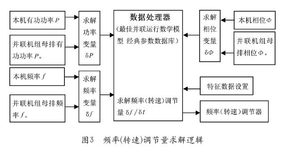部分負(fù)載接入或撤出并聯(lián)機組母排的時刻,必然引起有功功率、無功功率在并聯(lián)的各機組之間重新平分,以致出現(xiàn)機組環(huán)流和各機組頻率的波動。此刻,并機卡將本機的有功功率、頻率和相位與并機母排上的相對應(yīng)的這三個參量分別進行求解,得到有功功率變量δP、頻率變量δf和相位變量δΦ。數(shù)據(jù)處理器依照最佳并聯(lián)運行數(shù)學(xué)模型及經(jīng)典數(shù)據(jù)對它們計算、推演,求解出調(diào)節(jié)頻率最佳數(shù)值δf/δt作用于頻率(轉(zhuǎn)速)調(diào)節(jié)器和電子調(diào)速器,改變發(fā)動機主軸、發(fā)電機轉(zhuǎn)子的轉(zhuǎn)速,使本機組頻率及有功功率的均分達(dá)到并聯(lián)機組良好運行的條件。