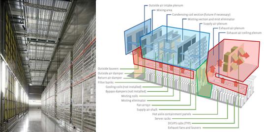 與水側(cè)自然冷卻系統(tǒng)相比,風側(cè)自然冷卻系統(tǒng)(FreeCooling或Air-sideeconomization)減少了能量轉(zhuǎn)換和傳遞環(huán)節(jié),節(jié)能效果更加直接和顯著。風側(cè)自然冷卻系統(tǒng)是指室外空氣直接通過濾網(wǎng)或者是間接通過換熱器將室外空氣冷量帶入到數(shù)據(jù)機房內(nèi),對IT設備進行降溫的冷卻技術(shù)。根據(jù)室外空氣是否進入機房內(nèi)部空間,可分為直接風側(cè)自然冷卻和間接風側(cè)自然冷卻系統(tǒng)。該技術(shù)實現(xiàn)冷源與負荷中心直接接觸,該系統(tǒng)不再通過傳統(tǒng)空調(diào)系統(tǒng)中制冷機組生產(chǎn)低溫冷媒對數(shù)據(jù)中心降溫,可顯著減少數(shù)據(jù)中心空調(diào)系統(tǒng)能耗。Google,F(xiàn)acebook等互聯(lián)網(wǎng)巨頭在美國、歐洲等氣候條件良好的地區(qū)建設的應用直接風側(cè)自然冷卻技術(shù)的數(shù)據(jù)中,PUE可實現(xiàn)接近1.07。