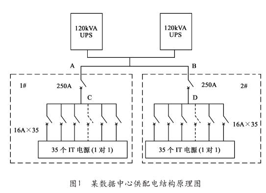 供配電結(jié)構(gòu)原理圖。圖中,兩臺120kVAUPS并聯(lián)后送到兩個配電柜,每個配電柜各有35個16A的微型斷路器。一天夜里1#配電柜突然有八個輸出斷路器跳閘。后來檢查結(jié)果是一個IT電源輸入短路,兩個IT電源輸入保險絲燒斷。這就提出了如下的問題: