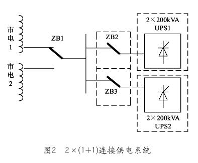 又如,某機(jī)關(guān)數(shù)據(jù)中心購置了4臺200kVAUPS做2?(1+1)連接,如圖2所示。機(jī)器安裝后在考機(jī)期間,為了檢測在市電轉(zhuǎn)換時的輸出不間斷功能,就在轉(zhuǎn)換開關(guān)ZB1由市電1向市電2切換瞬間,分路斷路器ZB2和ZB3跳閘,兩路并聯(lián)UPS1和UPS2各壞了1臺,檢查發(fā)現(xiàn)都是可控硅整流器燒毀和控制電路板受損。按道理說由市電1切到市電2是一