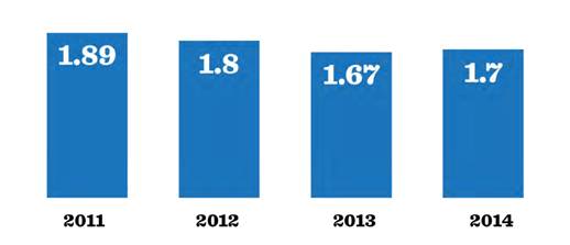 圖1:數(shù)據(jù)中心平均PUE調(diào)查,2011-2014