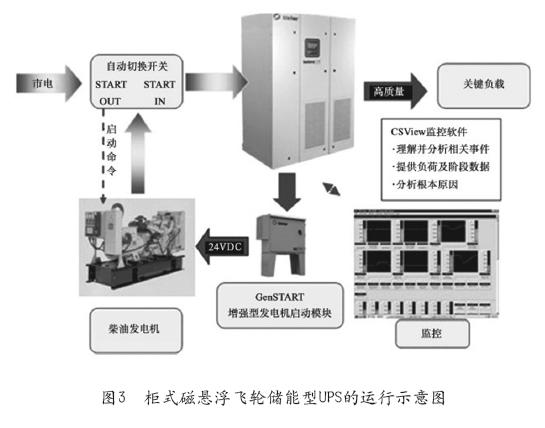 在傳統(tǒng)UPS供電系統(tǒng)中,當電力發(fā)生中斷時,蓄電池會支撐系統(tǒng)正常運轉(zhuǎn),與此同時,柴油發(fā)動機開始啟動,以此保證數(shù)據(jù)中心主機正常工作、空調(diào)連續(xù)運轉(zhuǎn)。蓄電池型UPS在此過程中,提供了“分鐘級”的電力供電。而飛輪儲能型UPS受制于機械儲能,僅僅能夠提供30s到1min電力供電,這也是飛輪UPS被詬病的主要原因。然而,專家指出,如今,市電電源的可靠性達到99.9%,有些重要的負載都采用雙路市電供電,市電的可靠性可以說已經(jīng)達到了99.99%。萬一市電中斷,后備電源的可靠性也可以達到99.9%,從市電到后備電源的切換,在技術(shù)上只需要10s的時間,這是一個公開的標準。目前,歐洲可做到8s??梢詳喽?飛輪儲能型UPS能提供30s的電力完全能夠滿足從市電到后備電源的可靠切換的要求。圖3給出了柜式磁懸浮飛輪儲能型UPS的運行示意圖。