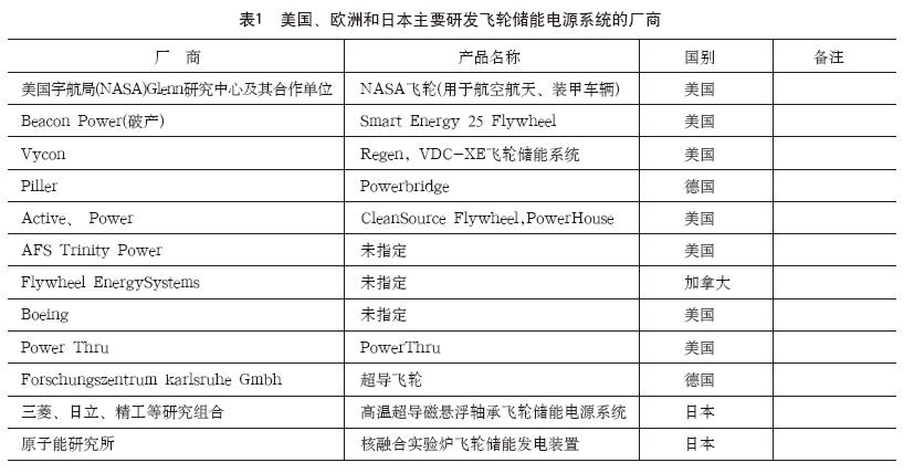 表1給出了美國、西歐和日本幾個著名的飛輪儲能電源系統(tǒng)的廠商。