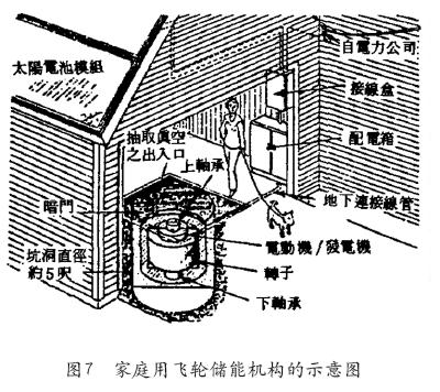對于普通家庭,儲能式飛輪也有廣闊的應(yīng)用前景。家庭用電系統(tǒng)可以采用電力公司供電、太陽能電池組、風力發(fā)電機組及微型汽油發(fā)電機來保障家庭的電源的不間斷供應(yīng)。而平時多余的太陽能和風能首先可以給后備的飛輪儲能機構(gòu)以及電池組充電,其次也可以用來給室內(nèi)加熱取暖,再次可以通過逆變器給電網(wǎng)反饋,并取得收益。圖7為家庭用飛輪輪能機構(gòu)的示意圖。