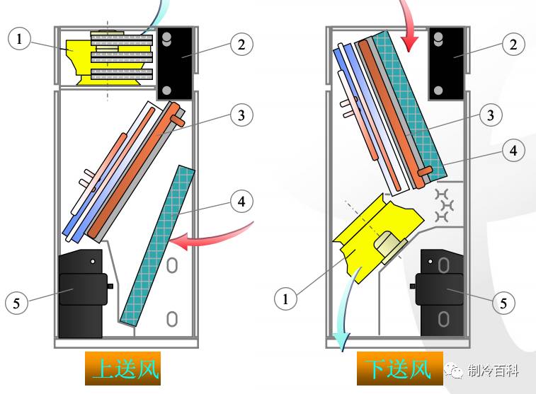 按出風(fēng)方式可分為:上出風(fēng)、下回風(fēng),下出風(fēng)、上回風(fēng),上出風(fēng)、側(cè)回風(fēng)。