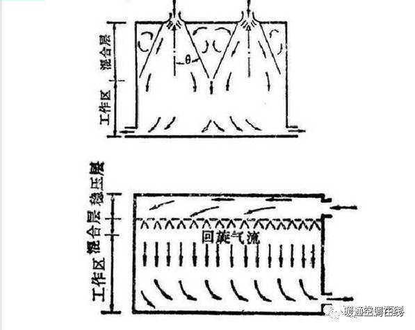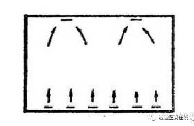 這種形式的送風(fēng)口布置在下部,回風(fēng)口布置在上部,如圖所示。