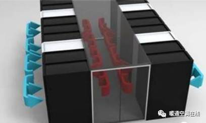 在多排機(jī)柜排列時(shí),當(dāng)機(jī)柜與機(jī)柜采用背對(duì)背的形式布置時(shí),可采用上送風(fēng)上回風(fēng)氣流組織方式,出風(fēng)口與回風(fēng)口的位置可以采用圖3-3的方式布置。形成以機(jī)柜冷熱通道相間隔的狀態(tài)。