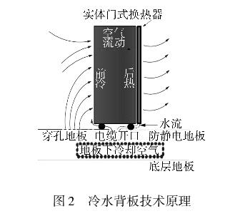 為降低能耗,本工程使用冷水背板技術,一種近距離制冷技術來改善局部空間發(fā)熱密度過高的問題。該背板安裝在機柜門后,不占用機房空間,使用過程中沒有功率損耗,也不產生噪聲,能夠滿足密度大的機房冷卻需要。該技術原理如圖2所示。