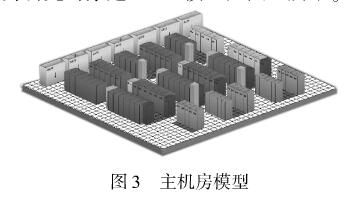 數據中心主機房應運行在一個穩(wěn)定、合理、溫濕度分布均勻的環(huán)境中 ,主機房采用下送上回的氣流組織方式。下送風的氣流方式,雖然有簡單、制冷效果好等優(yōu)點。但其應用中極易出現(xiàn)地板下走線擁堵等問題,導致氣流組織不合理,增長空調能耗。為避免以上問題,本文使用IBM機房專用氣流模擬分析軟件對主機房氣流組織、溫度場進行模擬,分析機房布局與氣流組織的合理性。因本工程主機房門窗較為密封,且開啟時間相當少;室外空氣難以滲透進室內,加上主機房無人值守,故假設此主機房空調系統(tǒng)運行在理想狀態(tài)下,室外溫度僅通過主機房外墻導熱到機房內,并且假設沒有室外濕度進入。