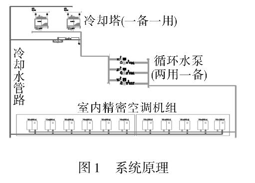 結合現(xiàn)場環(huán)境條件,以及在建筑格局、可靠性、安全性、初投資方面的比較,本工程選擇水冷直接蒸發(fā)式精密空調機組的空調方式,主要采用冷媒直接蒸發(fā)式蒸發(fā)器,冷凝器采用循環(huán)水直接冷卻方式,系統(tǒng)制冷介質為冷媒(R22)。系統(tǒng)原理如圖1所示。由圖1可知,系統(tǒng)主要由室內空調機組,冷卻水系統(tǒng)(含冷卻塔、水泵、管路)構成。冷卻塔一用一備,水泵設計為2用1備,冷卻水管采用機械循環(huán)同程式布置。冷卻塔放置樓頂,循環(huán)水泵房設置在冷水機房。