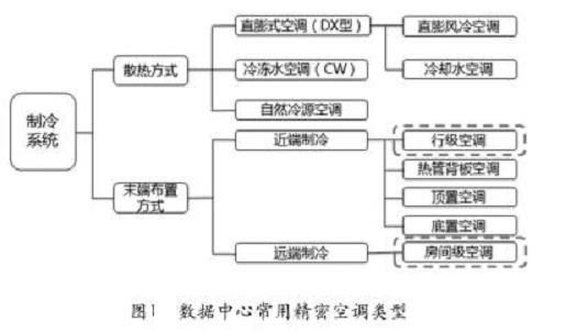 在目前的精密空調(diào)主流應(yīng)用中,從末端布置方式而言,主要有近端制冷的行級(jí)空調(diào)和遠(yuǎn)端制冷的房間級(jí)空調(diào)兩種;從散熱方式而言,分直膨式散熱和冷凍水散熱兩種方式,數(shù)據(jù)中心常用制冷系統(tǒng)如圖1所示。