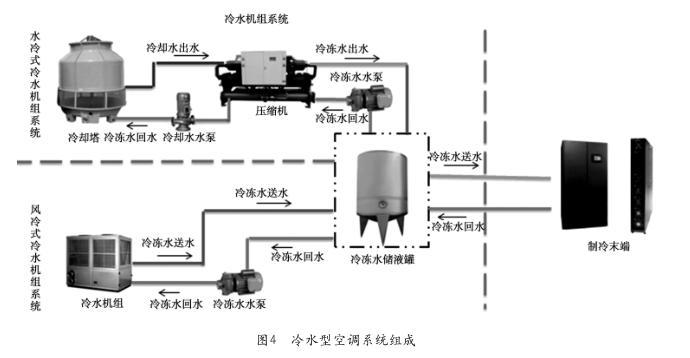 冷水機(jī)組作為蒸汽壓縮制冷方式的設(shè)備,按其冷凝器散熱方式的不同,可分為水冷式冷水機(jī)組和風(fēng)冷式冷水機(jī)組。水冷式冷水機(jī)組采用冷卻水為冷凝器進(jìn)行散熱,一般配合冷卻塔使用;風(fēng)冷式冷水機(jī)組利用環(huán)境空氣為冷凝器散熱,兩者的基本構(gòu)成如圖4所示。