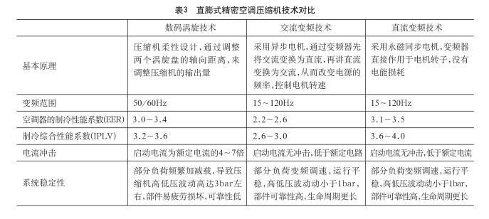 目前,直膨式精密空調(diào)行業(yè)里,室內(nèi)機(jī)的制冷壓縮機(jī)主要采用渦旋式壓縮機(jī)進(jìn)行變?nèi)萘空{(diào)節(jié)。渦旋式壓縮機(jī)通常采用數(shù)碼渦旋技術(shù)、交流變頻技術(shù)和直流變頻技術(shù)實(shí)現(xiàn)變?nèi)萘空{(diào)節(jié),三者的技術(shù)對(duì)比見(jiàn)表3: