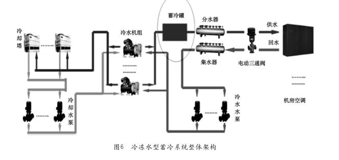根據(jù)Uptime對(duì)冷凍水型空調(diào)系統(tǒng)作出的關(guān)于連續(xù)制冷級(jí)別的定義,考慮UPS給精密空調(diào)配電時(shí),其主要應(yīng)用在不間斷制冷(ClassA級(jí)別)和連續(xù)制冷(ClassB級(jí)別)兩種場(chǎng)景,兩者的區(qū)別在于是否設(shè)置制冷罐,冷凍水二次泵是否采用UPS供電。若整體空調(diào)系統(tǒng)設(shè)置蓄冷罐進(jìn)行蓄冷,同時(shí)冷凍水二次泵、末端空調(diào)采用UPS供電,則為ClassA級(jí)別的不間斷制冷方案;若僅對(duì)冷凍水二次泵、末端空調(diào)采用UPS供電,并無(wú)配置蓄冷罐,則為ClassB級(jí)別的制冷方案。在實(shí)際應(yīng)用中,冷凍水型蓄冷系統(tǒng)的整體方案架構(gòu)如圖6所示。