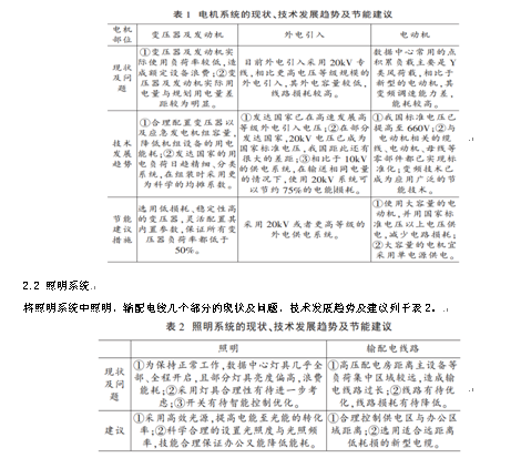 將電機系統(tǒng)中變壓器、發(fā)電機、外電引入、電動機幾個部分的現(xiàn)狀及問題、技術發(fā)展趨勢及建議列于表1。