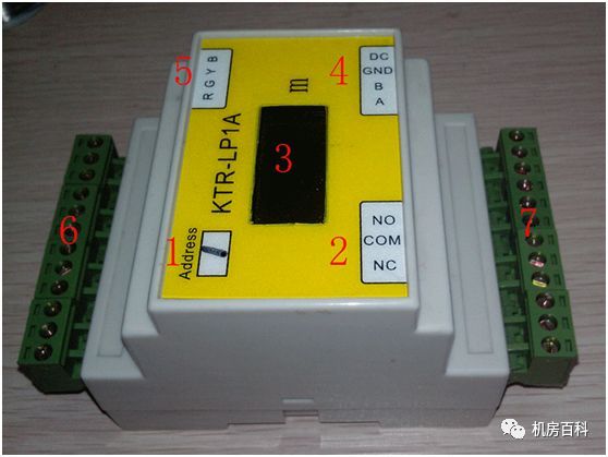 1標(biāo)有Address下面的空白框內(nèi)寫的是RS485的通信地址,2表示最邊上的三個接頭從外到內(nèi)的標(biāo)號分別為NC、COM、NO。3是顯示屏,正常運行沒有漏液顯示的是”no leak“,當(dāng)有漏發(fā)生,顯示的數(shù)值表示從漏液控制器到發(fā)生漏液的距離,單位是米。當(dāng)顯示的是”Error“表示漏液感應(yīng)線有故障。4表示最邊上的4個接線端子從外到內(nèi)分別為DC、GND、B、A。5表示從最邊上的4個接線端子從外到內(nèi)分別為B、Y、G、R。其它接線端子不用接。