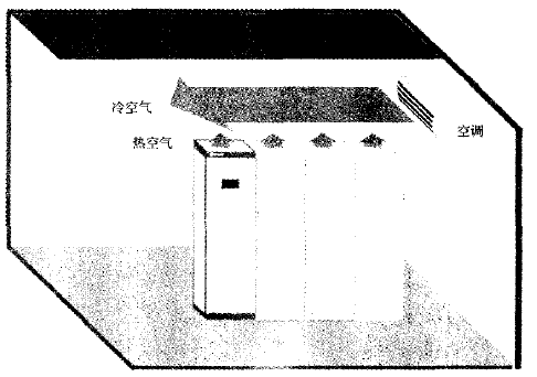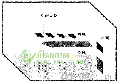 如圖1所示,當(dāng)前通信設(shè)備多采用風(fēng)扇冷卻方式。且通常采用前端進(jìn)風(fēng),后端出風(fēng)的形式??照{(diào)的出風(fēng)口對準(zhǔn)設(shè)備后方,冷空氣與從設(shè)備內(nèi)出來的熱風(fēng)會(huì)合,會(huì)很快使氣溫降低,但空調(diào)的高速出風(fēng),會(huì)對通信設(shè)備熱空氣的排出產(chǎn)生一個(gè)風(fēng)阻,削弱了通信設(shè)備熱空氣的排出速度,使得熱空氣在通信設(shè)備內(nèi)(尤其是模塊設(shè)備,如電源模塊)產(chǎn)生滯留,從而使設(shè)備內(nèi)局部溫度升高。因此,在這種情況下,會(huì)造成環(huán)境溫度低,而設(shè)備內(nèi)溫度高的“似低溫環(huán)境”現(xiàn)象,不利于設(shè)備的健康使用。有的用戶在此方式下,甚至打開后門讓空調(diào)風(fēng)對著面吹,以為利于設(shè)備散熱。根據(jù)電源廠家對這種情況與空調(diào)側(cè)吹的情況做了溫升對比,對比對象為在同一負(fù)載條件下同型號的兩套通信電源系統(tǒng)的模塊機(jī)內(nèi)溫度??照{(diào)前面?zhèn)却档南到y(tǒng),在模塊后內(nèi)側(cè)1寸處空氣溫升約為13℃,而打開后門對里面正吹的電源,雖然感覺不到電源設(shè)備發(fā)熱,但模塊內(nèi)相同位置的溫升卻達(dá)到15℃~16℃,并沒有使電源模塊的散熱得到合理改善。