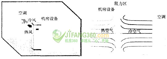 如圖2所示,在這種方式下,空調(diào)掃風(fēng)和氣流擴(kuò)散從側(cè)面對通信設(shè)備后面產(chǎn)生反壓,仍然會(huì)對通信設(shè)備熱空氣從后面排出產(chǎn)生一個(gè)風(fēng)阻,同第1種方式一樣,也會(huì)造成環(huán)境溫度低,而設(shè)備內(nèi)溫度高的“假低溫環(huán)境”現(xiàn)象,不利于設(shè)備的健康使用。