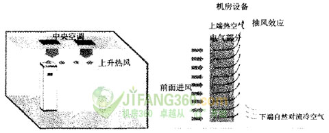 若按圖3所示將通信設(shè)備置于中央空調(diào)出風(fēng)口下端,雖然下行的冷空氣會(huì)迅速與上升的熱空氣產(chǎn)生熱交換使之冷卻,但下行的風(fēng)壓會(huì)對上行的熱空氣形成阻力,破壞抽風(fēng)效應(yīng)的形成,使熱空氣滯留設(shè)備內(nèi)部,同樣產(chǎn)生環(huán)境溫度低,而設(shè)備內(nèi)溫度高的“假低溫環(huán)境”現(xiàn)象,不利于設(shè)備的健康使用,尤其對后門無通風(fēng)孔或通風(fēng)孔不足,而對抽風(fēng)效應(yīng)依賴的設(shè)備,影響更大。