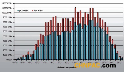 E2V的高效調(diào)理性和適應(yīng)能力意味著空調(diào)體系能夠運轉(zhuǎn)在最大功率下。當室外溫度合當令(夜間或冬秋季月份),可將冷凝壓力下降至10bar,從而下降了耗電量。另一方面,機械式熱力脹大閥總是強制機組運轉(zhuǎn)在冷凝壓力超越17bar的情況下。在較熱的氣候情況下,電子脹大閥的長處是能夠更好地利用蒸騰器;在較冷的氣候下,其能夠下降機組的運轉(zhuǎn)壓力,從而下降耗電量,進步功率。