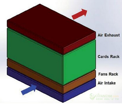 冷卻系統(tǒng)的組織,是為了使其符合機架供應(yīng)商的標(biāo)準(zhǔn)。如圖1所示,其顯示了我們最終的設(shè)計草圖。進氣口是在前端的底部,而空氣的排出口是在頂部的背面或頂部??諝饬魇菑臋C架的底部流到頂部。最小空氣流量為每秒0.2立方米(m3/s)或420立方英尺每分鐘(cfm)。這一空氣流被定義了,以便該系統(tǒng)將能夠與現(xiàn)有的卡和機架向后兼容。機架的大小被固定在大約0.4 m x 0.44 m x 0.25 m (H x W x D),這意味著系統(tǒng)中的空氣每秒將被替換約四次。