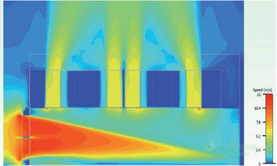 圖11:EMI屏蔽進氣口的距離與風(fēng)扇的進氣氣流分布:30毫米(0.2立方米/秒)。