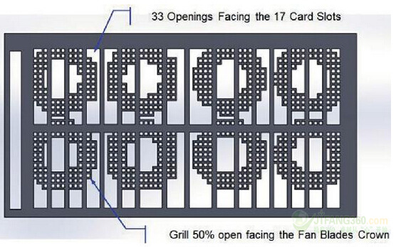 我們創(chuàng)建了一個多孔板,其具有兩個主要功能:1)在沒有插槽的地方停止氣流流動,以避免將空氣吹入封閉的EMI屏蔽物;2)在我們觀察到較高的氣流速度的區(qū)域減少氣流流動。這個多孔流體分配板(FDP),如圖9所示,必須是與該EMI屏蔽接觸。其將從而在入口處關(guān)閉,由卡機架的另一側(cè)已經(jīng)關(guān)閉了蜂窩孔格封閉。因為板不需要維護,它可以連接到EMI屏蔽代替風(fēng)扇機架。風(fēng)扇和該多孔板之間的距離是至關(guān)重要的。氣流必須能夠被通過開口槽而不產(chǎn)生不可接受的壓力下降。