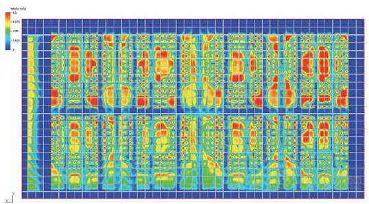 在創(chuàng)建一個組件,使每個插槽的氣流均勻統(tǒng)一之前,我們決定看看仿真模擬空氣流量,而不考慮漩渦。我們觀察到在遠離風(fēng)扇75毫米的一定距離,速度變化仍然非常重要(圖8)。