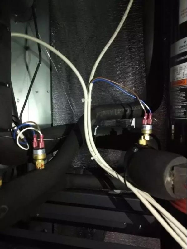 一般情況下高低壓力開(kāi)關(guān)自帶控制線是與開(kāi)關(guān)密封連接的,沒(méi)有自帶控制線的就需要將導(dǎo)線與開(kāi)關(guān)進(jìn)行插接連接,問(wèn)題大多就出現(xiàn)在這樣的連接上。由于機(jī)組運(yùn)行時(shí)振動(dòng)和氣流的影響,插接點(diǎn)易松動(dòng),連接線易斷掉,而且連接點(diǎn)是不密封的,很多情況下機(jī)組內(nèi)的冷凝水會(huì)飛濺到此,加快腐蝕或產(chǎn)生誤動(dòng)作。